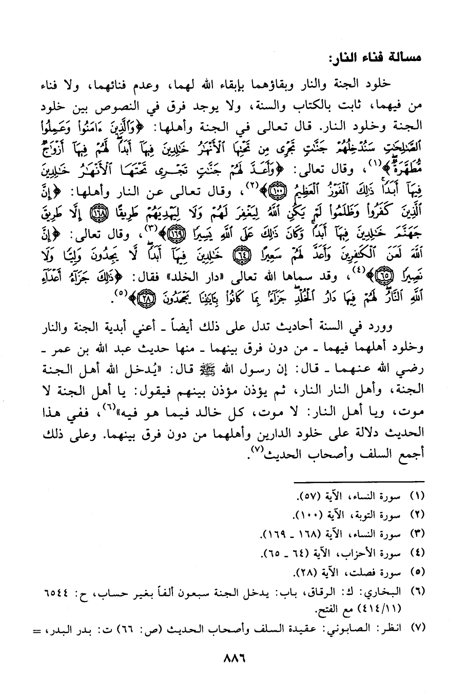 خلود الجنة والنار وبقاؤهما بإبقاء الله لهما، وعدم فنائهما، ولا فناء من فيهما، ثابت بالكتاب والسنة، ولا يوجد فرق في النصوص بين خلود الجنة وخلود النار. قال تعالى في الجنة وأهلها: {وَالَّذِينَ آمَنُوا وَعَمِلُوا الصَّالِحَاتِ سَنُدْخِلُهُمْ جَنَّاتٍ تَجْرِي مِنْ تَحْتِهَا الْأَنْهَارُ خَالِدِينَ فِيهَا أَبَداً لَهُمْ فِيهَا أَزْوَاجٌ مُطَهَّرَةٌ} 1، وقال تعالى: {وَأَعَدَّ لَهُمْ جَنَّاتٍ تَجْرِي تَحْتَهَا الْأَنْهَارُ خَالِدِينَ فِيهَا أَبَداً ذَلِكَ الْفَوْزُ الْعَظِيمُ} 2، وقال تعالى عن النار وأهلها: {إِنَّ الَّذِينَ كَفَرُوا وَظَلَمُوا لَمْ يَكُنِ اللَّهُ لِيَغْفِرَ لَهُمْ وَلا لِيَهْدِيَهُمْ طَرِيقاً إِلَّا طَرِيقَ جَهَنَّمَ خَالِدِينَ فِيهَا أَبَداً وَكَانَ ذَلِكَ عَلَى اللَّهِ يَسِيراً} 3، وقال تعالى: {إِنَّ اللَّهَ لَعَنَ الْكَافِرِينَ وَأَعَدَّ لَهُمْ سَعِيراً خَالِدِينَ فِيهَا أَبَداً لا يَجِدُونَ وَلِيّاً وَلا نَصِيراً} 4، وقد سماها الله تعالى "دار الخلد" فقال: {ذَلِكَ جَزَاءُ أَعْدَاءِ اللَّهِ النَّارُ لَهُمْ فِيهَا دَارُ الْخُلْدِ جَزَاءً بِمَا كَانُوا بِآياتِنَا يَجْحَدُونَ} 5.