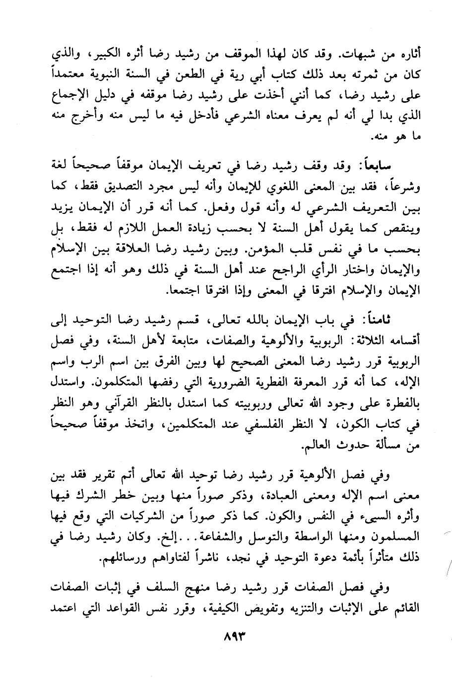 أثاره من شبهات. وقد كان لهذا الموقف من رشيد رضا أثره الكبير، والذي كان من ثمرته بعد ذلك كتاب أبي رية في الطعن في السنة النبوية معتمداً على رشيد رضا، كما أنني أخذت على رشيد رضا موقفه في دليل الإجماع الذي بدا لي أنه لم يعرف معناه الشرعي فأدخل فيه ما ليس منه وأخرج منه ما هو منه.