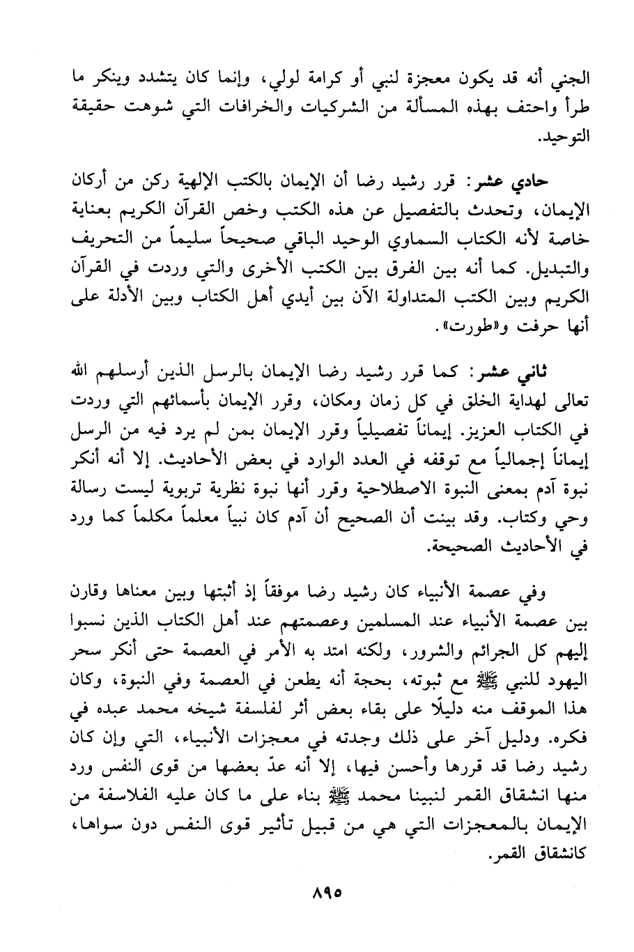 حادي عشر: قرر رشيد رضا أن الإيمان بالكتب الإلهية ركن من أركان الإيمان، وتحدث بالتفصيل عن هذه الكتب وخص القرآن الكريم بعناية خاصة لأنه الكتاب السماوي الوحيد الباقي صحيحاً سليماً من التحريف والتبديل. كما أنه بين الفرق بين الكتب الأخرى والتي وردت في القرآن الكريم وبين الكتب المتداولة الآن بين أيدي أهل الكتاب وبين الأدلة على أنها حرفت و"طورت".