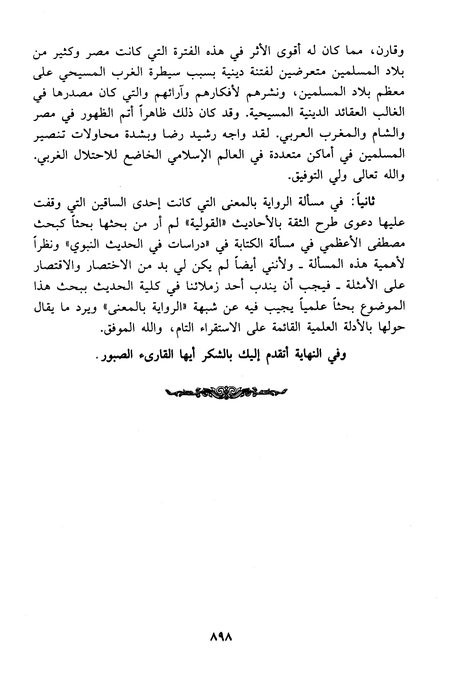 ثانياً: في مسألة الرواية بالمعنى التي كانت إحدى الساقين التي وقفت عليها دعوى طرح الثقة بالأحاديث "القولية" لم أر من بحثها بحثاً كبحث مصطفى الأعظمي في مسألة الكتابة في "دراسات في الحديث النبوي" ونظراً لأهمية هذه المسألة ـ ولأنني أيضاً لم يكن لي بد من الاختصار والاقتصار على الأمثلة ـ فيجب أن يندب أحد زملائنا في كلية الحديث ببحث هذا الموضوع بحثاً علمياً يجيب فيه عن شبهة "الرواية بالمعنى" ويرد ما يقال حولها بالأدلة العلمية القائمة على الاستقراء التام، والله الموفق.