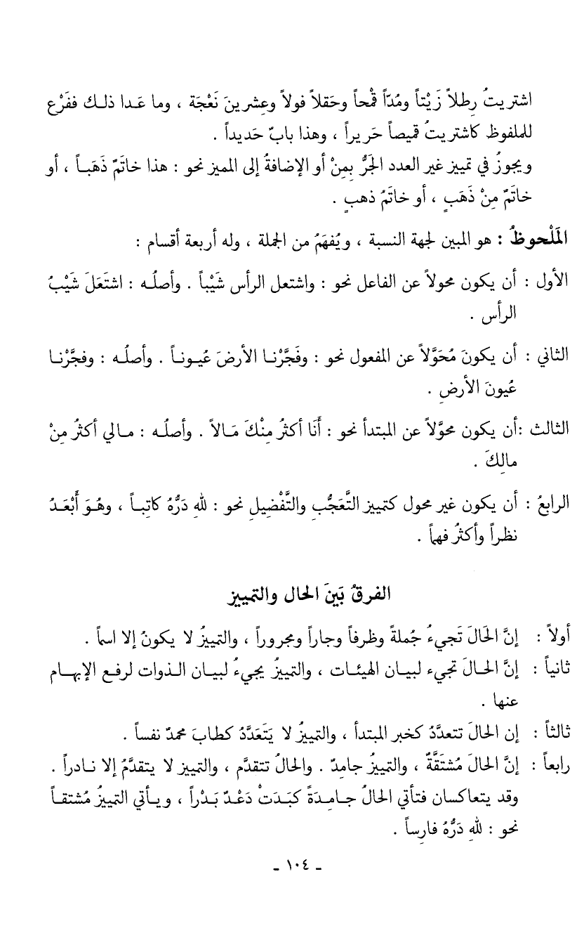 اشتريت رطلاً زيتاً ومداّ قمحاً وحقلاً فولاً وعشرين نعجة، وما عدا ذلك ففرْع للملفوظ كاشتريت قميصاً حريراً، وهذا باب حديداً.