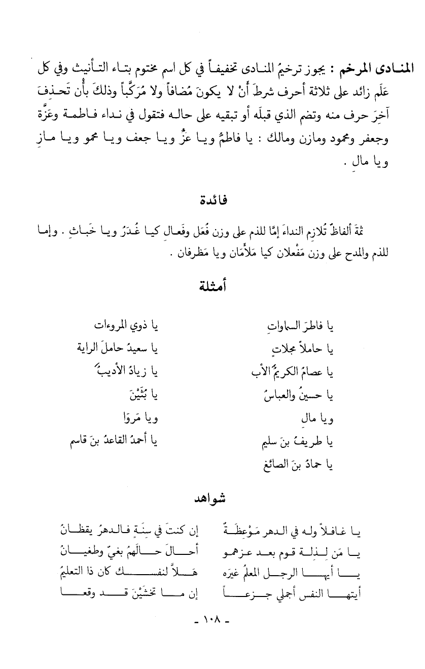المنادى المرخم: يحوز ترخيم المنادي تخفيفاً في كل اسم مختوم بتاء التأنيث وفي كل علم زائد على ثلاثة أحرف شرط أن لا يكون مضافاً ولا مركباً وفي ذلك بأن تحذف آخر حرف منه وتضم الذي قبله أو تبقيه على حاله فتقول في نداء فاطمة وعزة وجعفر ومحمود ومازن ومالك: يا فاطمً ويا عز ويا جعف ويا محمو ويا مازِ ويا مالِ.