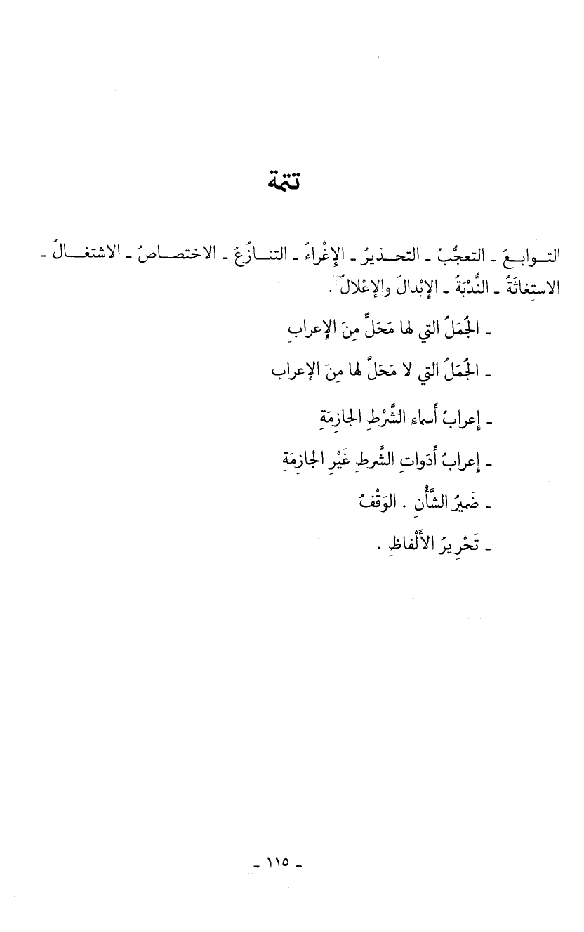 التوابعُ - التعجُّبُ - التحذيرُ - الإغراءُ - التنازعُ - الاختصاصُ - الاشتغالُ - الاستغاثةُ - الندْبَةُ - الإبدالُ والإعْلالٌ.