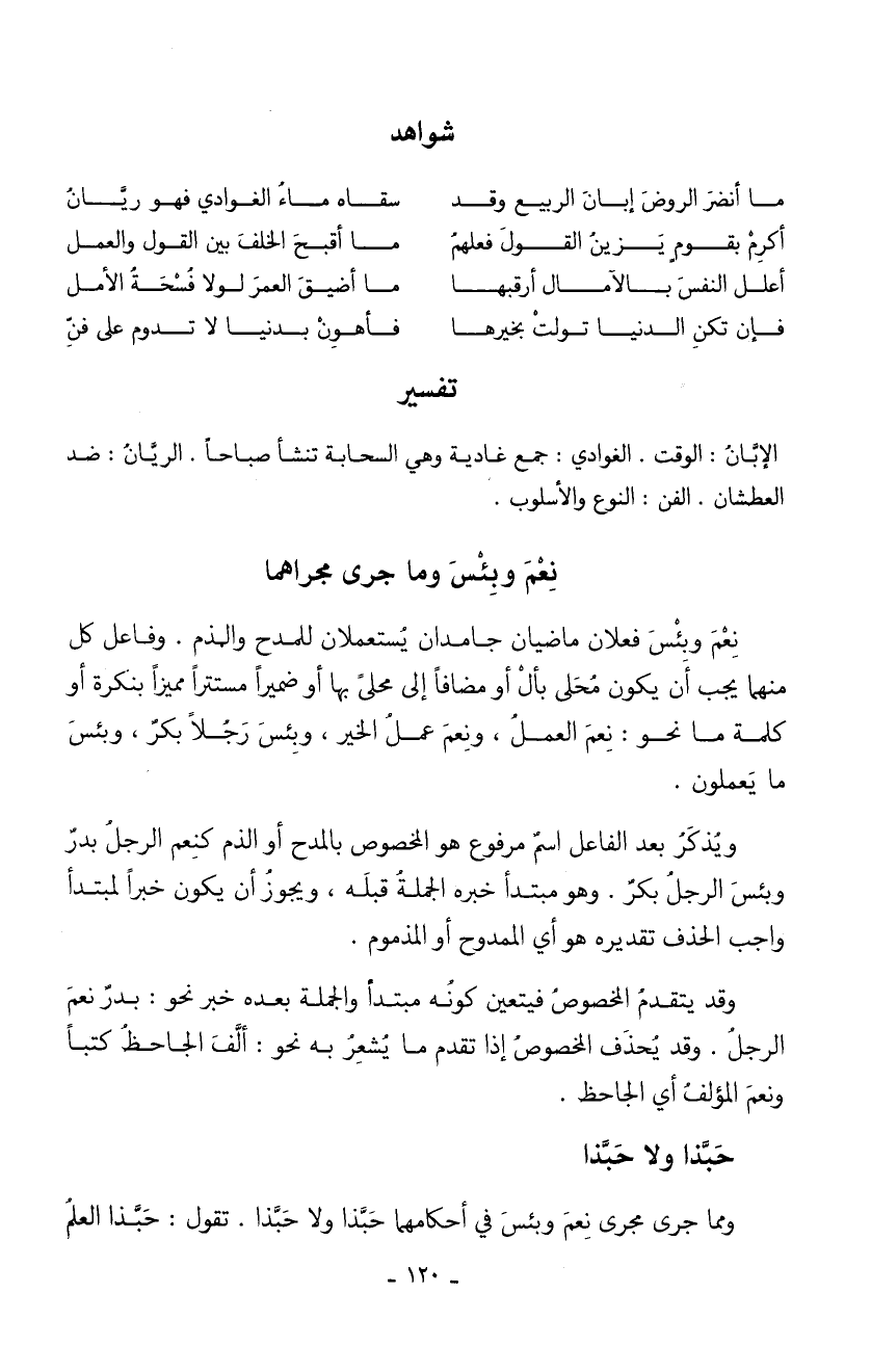 نعمَ وبئس فعلان ماضيان جامدان يستعملان للمدح والذم. وفاعل كل منهما يجب أن يكون محلى بأل أومضافاً إلى محلى بها أوضميراً مستتراً مميزاً بنكرة أو كلمة ما نحو: نعم العملُ، ونعم عمل الخير، وبئس رجلاً بكر، وبئس ما يعملون.