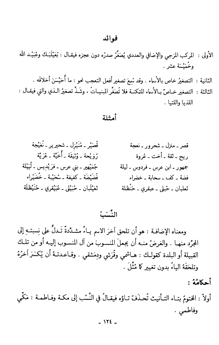ومعناه الإضافة: هو أن تلحق آخر الاسم ياء مشددة تدل على نسبته إلى المجرد منها. والغرض منه أن يجعل المنسوب من آل المنسوب إليه أو من تلك القبيلة أو البلدة كقولك: هاشمي وقرشي ودمشقي. وقاعدته أن يكسر آخرهُ وتلحقهُ الياء بدون تغيير كما مُثَّلَ.
