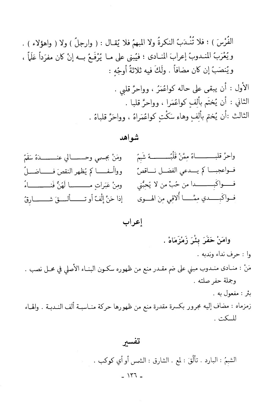 الفُرْسَ) ؛ فلا تُبْدَبُ النكرةُ ولا المبهمُ فلا يقال: (وارجلُ) ولا (واهؤلاء) . ويُعْرَبُ المندوبُ إعراب المنادى؛ فيبنى على ما رفع به إن كان مفرداً علماً، وينصب إن كان مضافاً. ولك فيه ثلاثة أوجُهٍ: