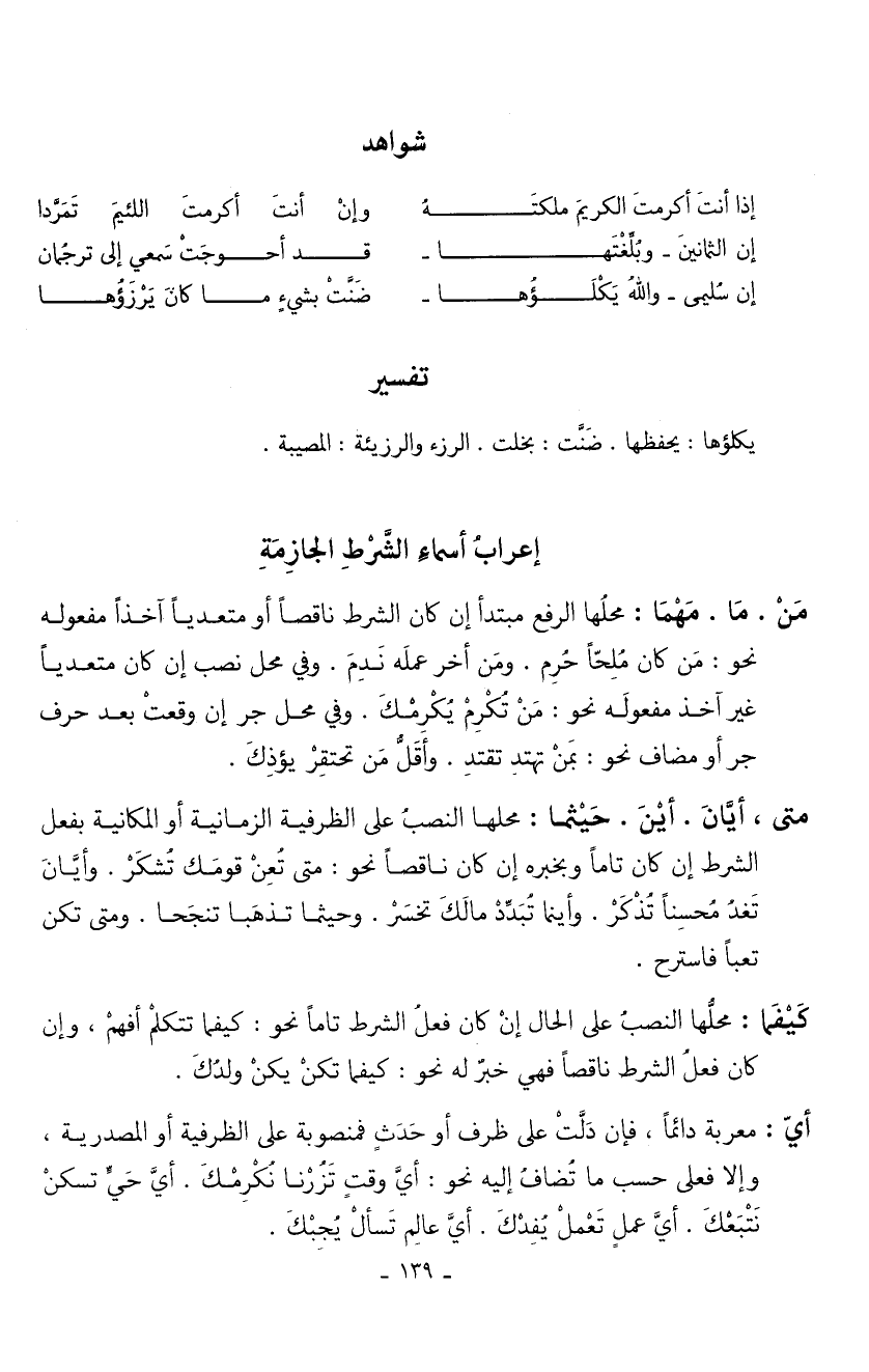 متى، أيان. أين. حيثما: محلها النصب على الظرفية الزمانية أو المكانية بفعل الشرط إن كان تاماً وبخبره إن كان ناقصاً نحو: متى تعنْ قومك ئشكرْ. وأيانَ تغذُ محسناً تذكرْ. وأينما تُبدَّدْ مالك تخسر. وحيثما تذهبا تنجحا. ومتى تكن تعباً فاسترح.