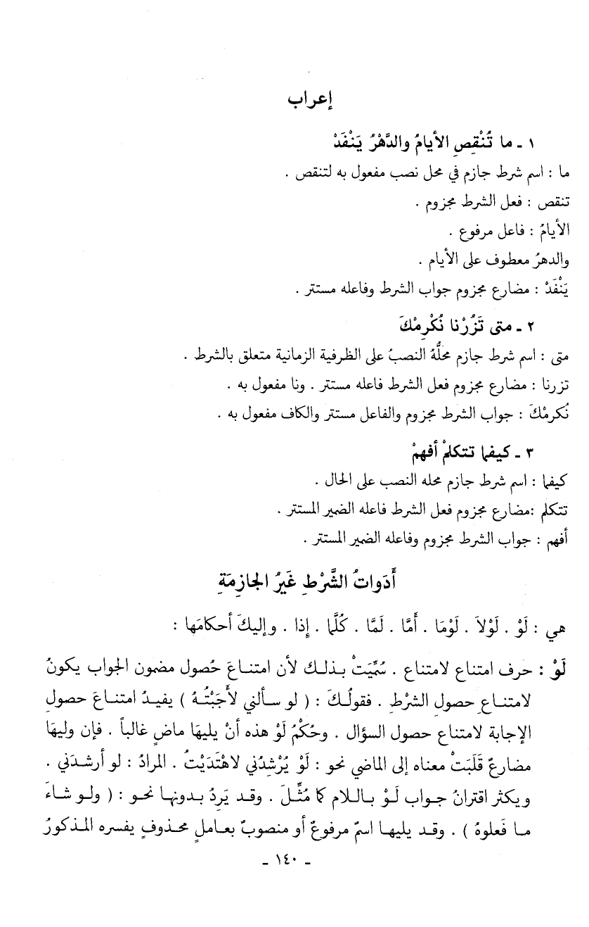 لوْ: حرف امتناع لامتناع. سميت بذلك لأن امتناع حصول مضمون الجواب يكون لامتناع حصول الشرط. فقولك: (لو سألني لأجبتهُ) يفيد امتناع حصول الإجابة لامتناع حصول السؤال. وحكم لو هذه أن يليها ماض غالباً. فإن وليها مضارع قلبت معناه إلى الماضي نحو: لو يرشدني لاهتديتُ. المراد: لو أرشدني. ويكثر اقتران جواب لو باللام كما مثل. وقد يرد بدونها نحو: (ولو شاء اللَّهُ ما فعلوهُ) ، وقد يليها اسم مرفوع أو منصوب بعامل محذوف يفسره المذكورُ