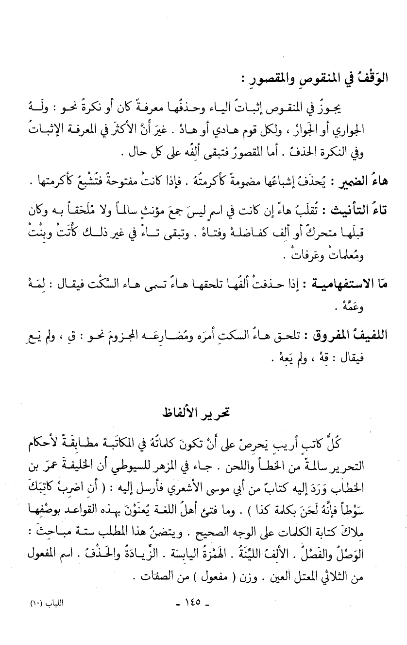 يجوز في المنقوص إثبات الياء وحذفها معرفة كان أو نكرة نحو: ولهُ الجواري أو الجوارْ، ولكل قوم هادي أو هادْ. غير أن الأكثر في المعرفة الإثبات وفي النكرة الحذف. أما المقصور فتبقى ألفه على كل حال.