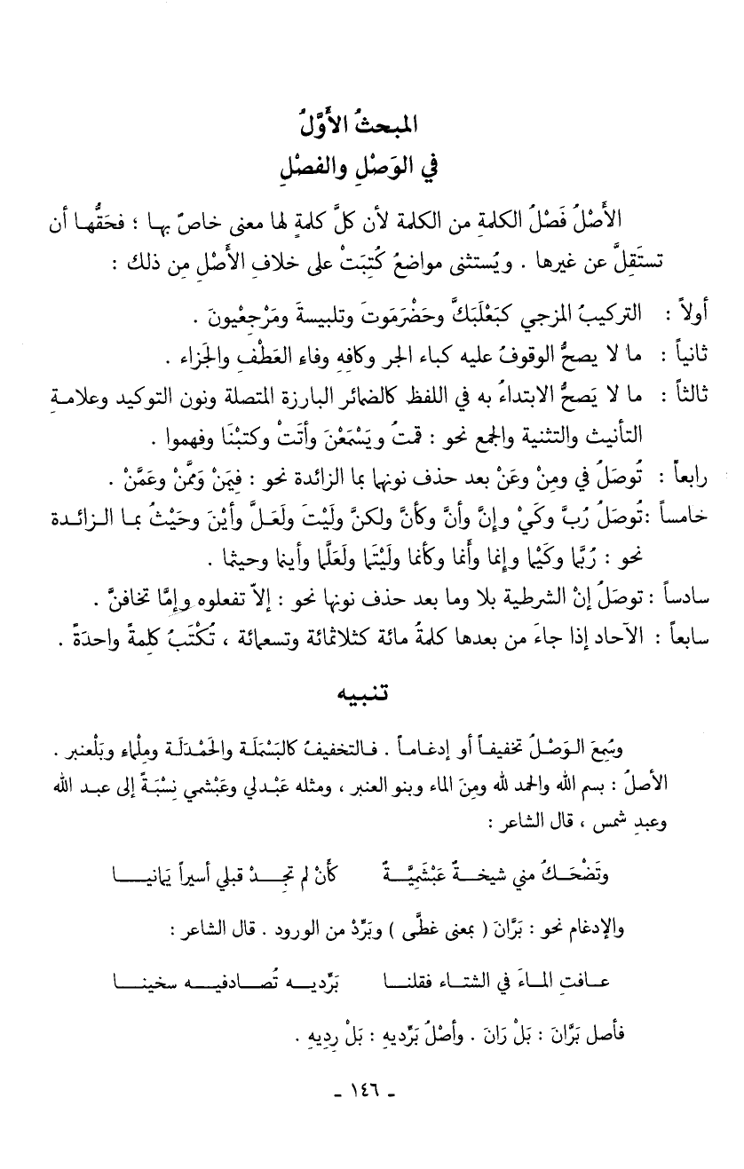 وسمع الوصل تخفيفاً أو إدغاما. فالتخفيض كالبسملة والحمدلة وملماء وبلعنبر. الأصل: بسم الله والحمد لله ومن الماء وبنو العنبر، ومثله عبدلي وعبشمي نسبة إلى عبد الله وعبد شمس، قال الشاعر: