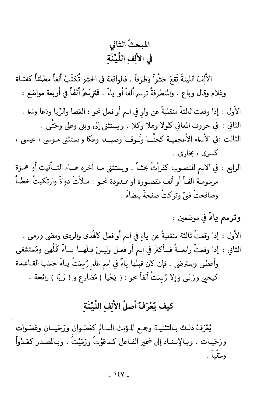 الثاني: إذا وقعت رابعة فأكثر في اسم أو فعل وليس قبلها ياء كملهى ومستشفى وأعطى واسترضى. فإن كان قبلها ياء في اسم علم رسمت ياء حسب القاعدة كيحيى وريي وإلا رسمت ألفا نحو: (يحيا) مضارع و (ريا) رائحة.