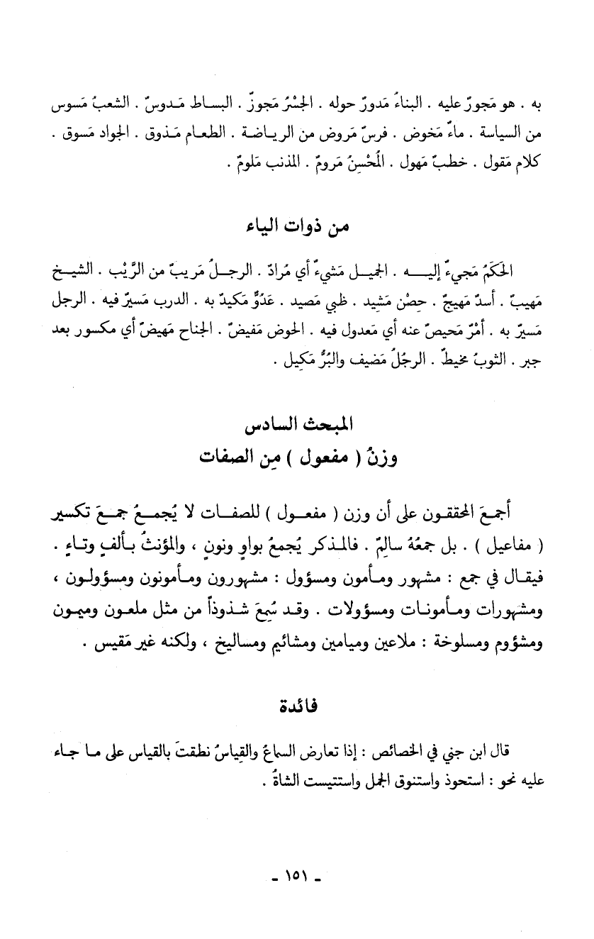 الحكم مجئ إليه، الجميل مشئ أي مراد. الرجل مريب من الريب. الشيخ مهيب، أسد مهيج. حصن مشيد. طبي مصيد. عدو مكيد به. الدرب مسير فيه. الرجل مسير به. أمر محيصٌ عنه أي معدول فيه. الحوض مفيض. الجناح مهيض أي مكسور بعد