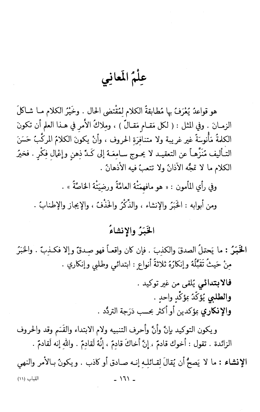 ومن أبوابه: الخبرُ والإنشاء، والذكر والحذفُ، والإيجاز والإطنابُ.