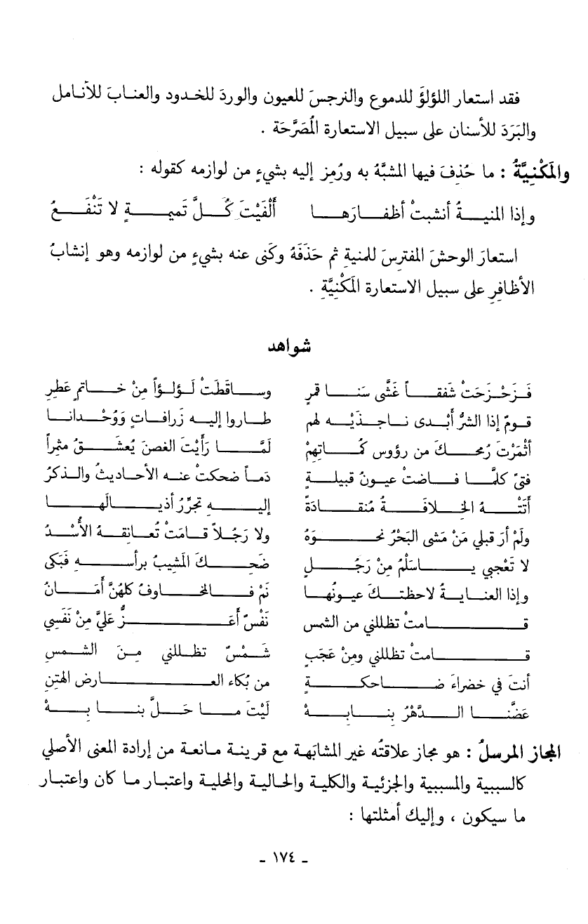 فقد استعار اللؤلؤ للدموع والنرجس للعيون والورد للخدود والعناب للأنامل والبرد للأسنان على سبيل الاستعارة المصرحة.