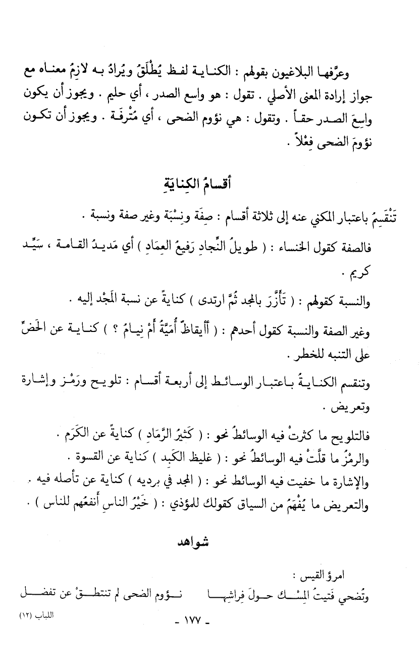 وعرفها البلاغيون بقولهم: الكناية لفظ يطلق ويرأد به لازم معناه مع جواز إرادة المعنى الأصلي. تقول: هو واسع الصدر، أي حليم. ويجوز وأن يكون واسع الصدر حقا. وتقول: هي نؤوم الضحى، أي مترفَة. ويجوز أن تكون نؤوم الضحى فعلاً.