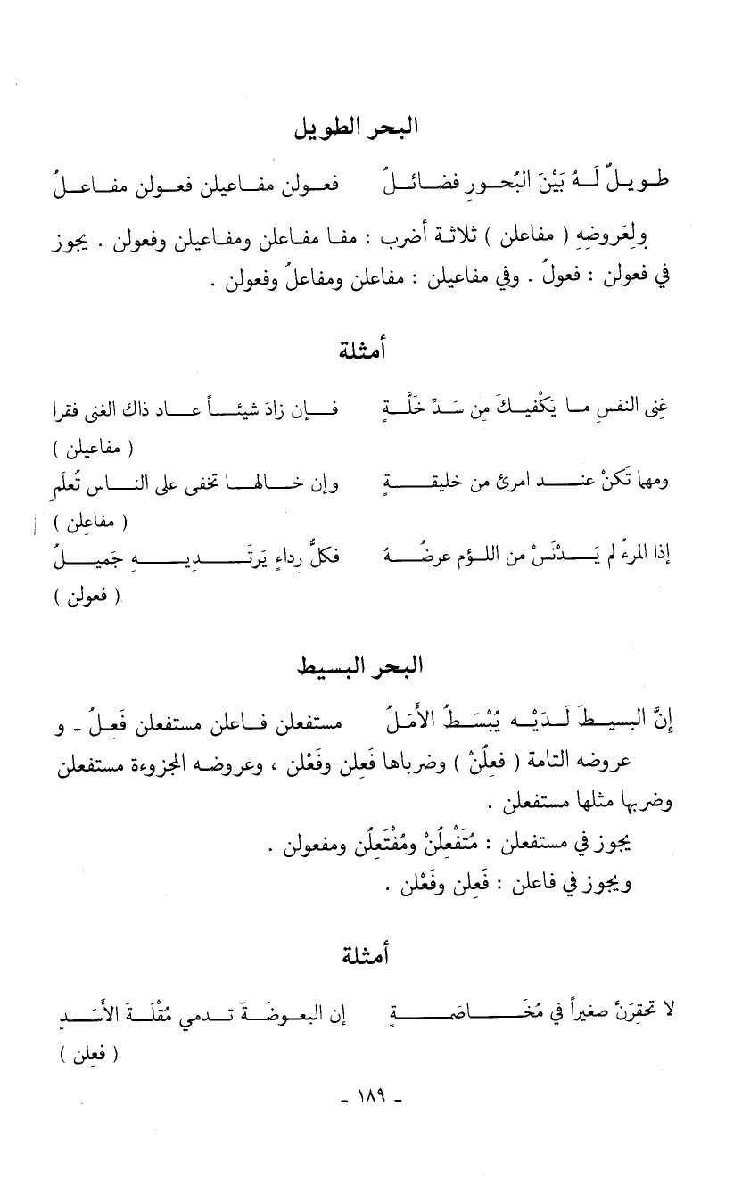 إن البسيط لديُه يبسط الأملُ ... مستفعلن فأعلن مستفعلن فعَلُ - وعروضه التامة (فعلنْ) وضرباها فعِلن وفعْلن، وعروضه المجزوءة مستفعلن