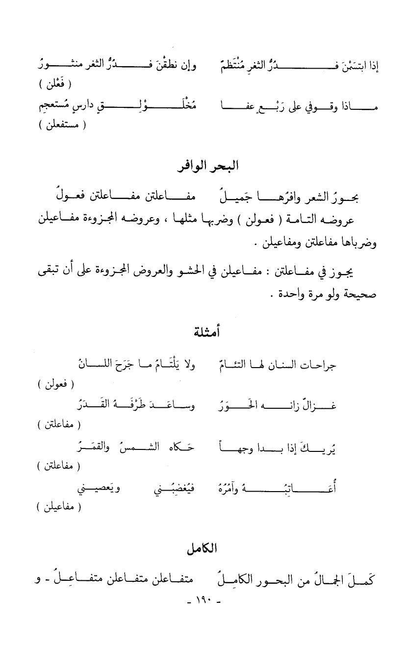 بحور الشعر وافرها جميلُ ... مفاعلتن مفاعلين فعولُ عروضه التامة (فعولن) وضربها مثلها، وعروضه المجزوءة مفاعيلن