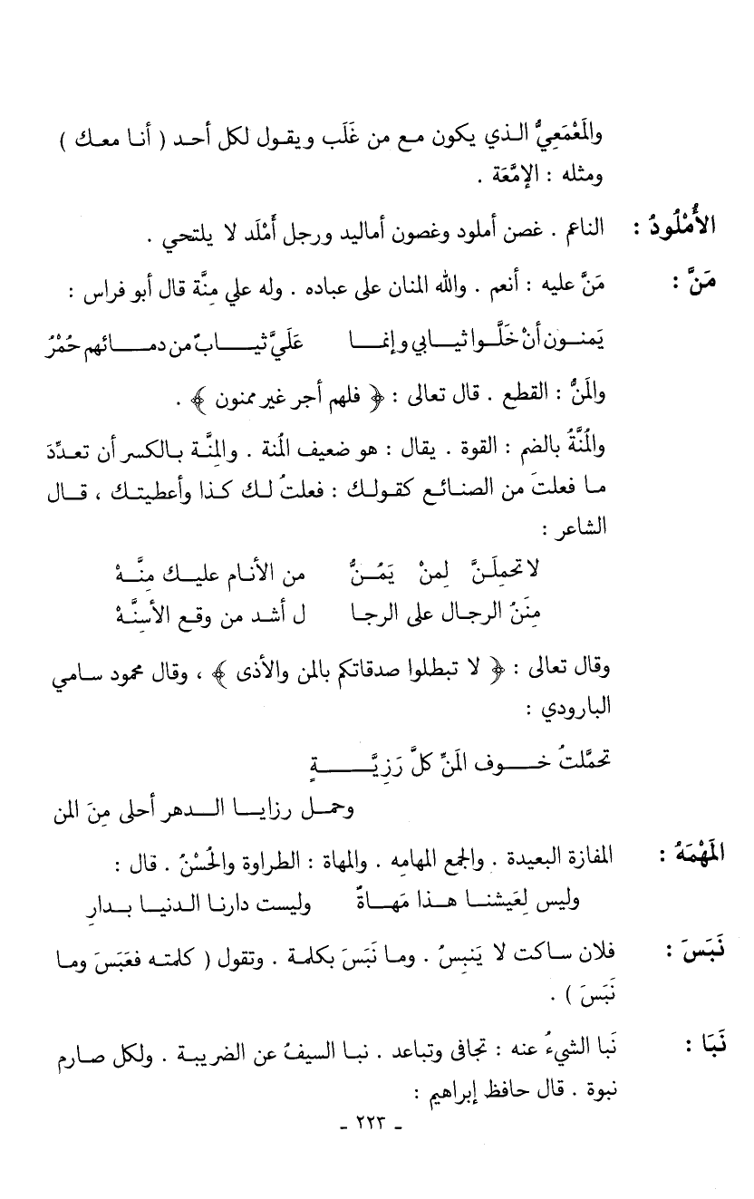 منَّ: منَّ عليه: أنعم. والله المنان على عباده. وله علي منة قال أبو فراس:
