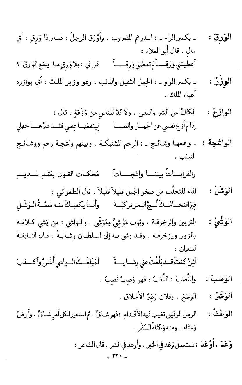 الوشيُ: التزيين والزخرفة، وثوب موشيَّ وموشّي. والواشي: من يشي كلامه بالزور ويزخرفه. وقد وشى به إلى السلطان وشاية. قالت النابغة للنعمان: