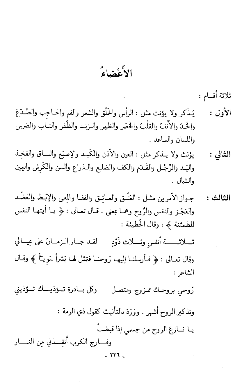 الثالث: جواز الأمرين مثل: العنُق والعاتق والقفا والمعى والإبط والعضُد والعجز والنفس والروح وهما بمعنى، قال تعالى: {يَا أَيَّتُهَا النَّفْسُ الْمُطْمَئِنَّةُ} ، وقال الُحطيئة: