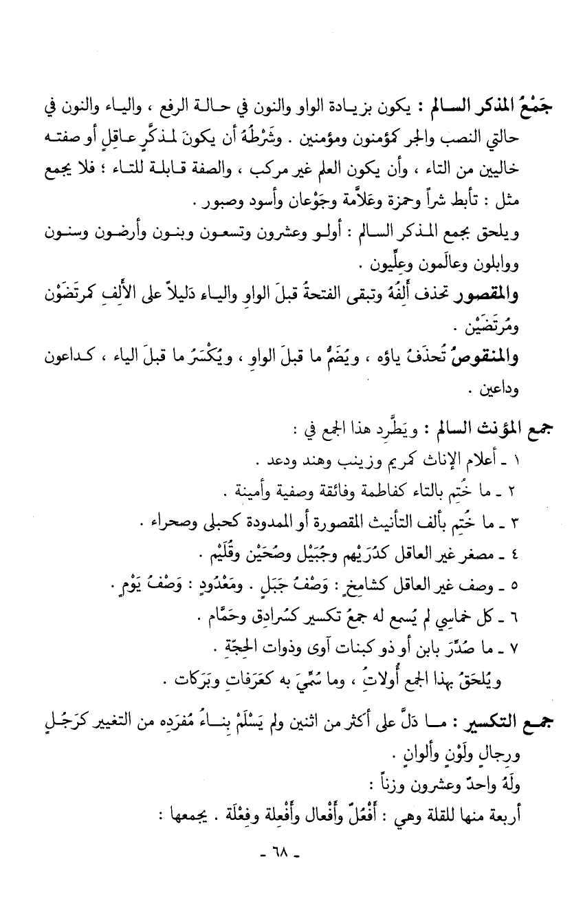 جمع المذكر السالم: يكون بزيادة الواو والنون في حالة الرفع، والياء والنون في حالتي النصب والجر كمؤمنون ومؤمنين. وشرطُهُ أن يكون لمذكر عاقل أو صفته خاليين من التاء، وأن يكون العلم غيرمركب، والصفة قابلة للتاء فلا يجمع مثل: تأبط شراً وحمزة وعلامة وجوعان وأسود وصبور.