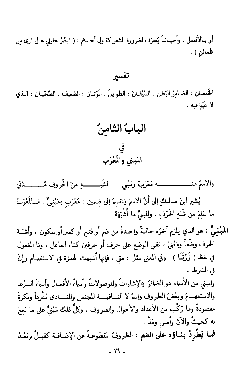 المبنيُّ: هو الذي يلزم أخزه حالة واحدة من ضم أو فتح أو كسر أو سكون، وأشبة الحرف وضعاً ومعنى، ففي الوضع على حرف أو حرفين كتاء الفاعل، ونا المفعول في لفظ (زرْتنا) . وفي المعى مثل: متى، فإنها أشبهت الهمزة في الاستفهام وإن في الشرط.