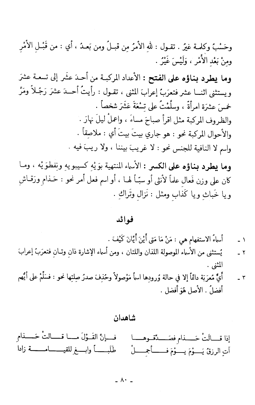 وما يطرد بناؤه على الفتح: الأعداد المركبة من أحد عشر إلى تسعة عشر ويستثنى اثنا عشر فتعرب إعراب المثنى، تقول: رأيت أحد عشر رجلاً ومر خمس عشرة امرأة، وسلمت على تسعة عشر شخصاً.