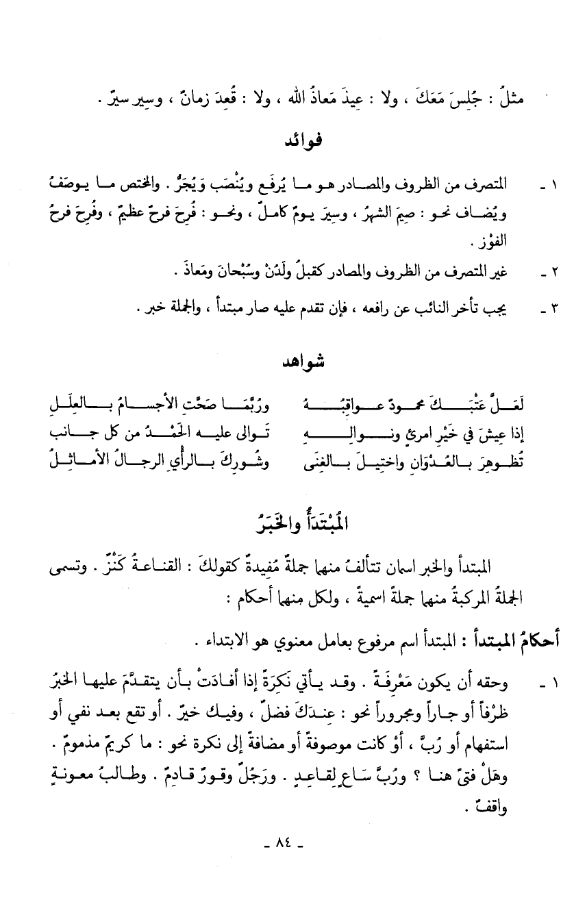 1 - المتصرف من الظروف والمصادر هو ما يرفع وينصب ويجر. والمختص ما يوصف ويضاف نحو: صيم الشهر، وسير يوم كامل، ونحو: فرحَ فرحٌ عظيم، وفُرحَ فرحٌ الفوز.