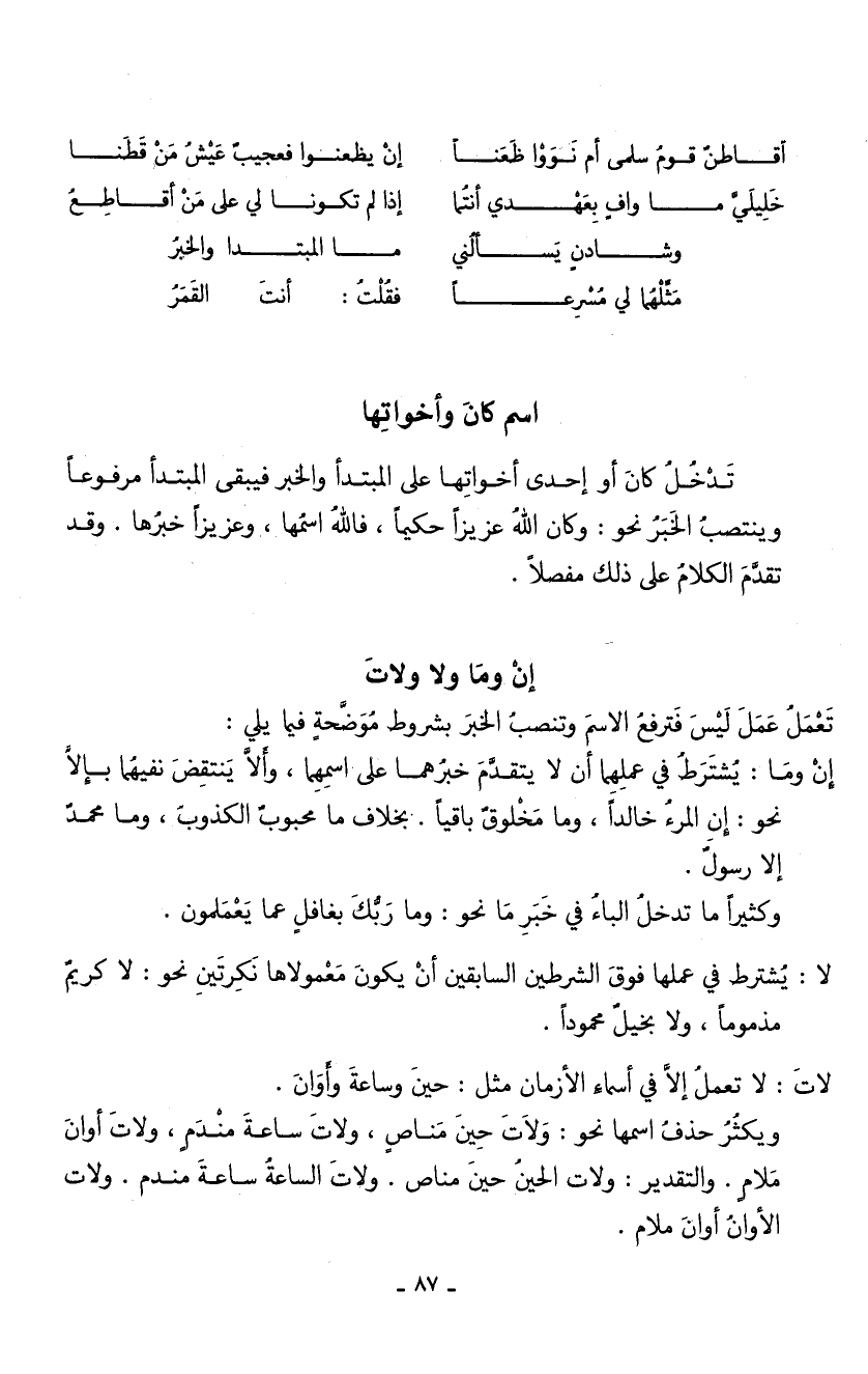 تدخل كان أو إحدى أخواتها على المبتدأ والخبر فيبقى المبتدأ مرفوعاً وينتصب الخبر نحو: وكان الله عزيزاً حكيماً، فالله اسمها، وعزيزاً خبرها. وقد تقدم الكلام على ذلك مفصلاً.