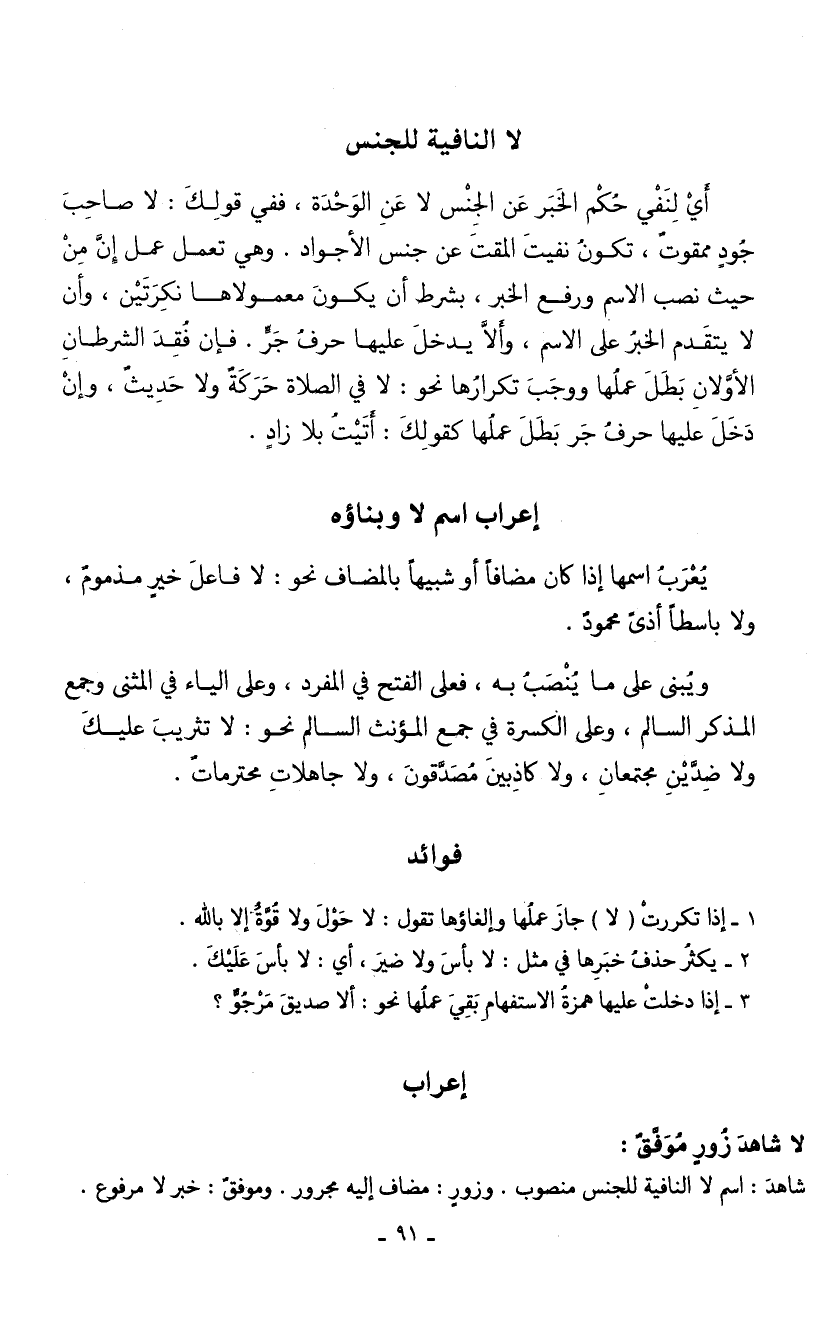 أي لنفي حكم الخبر عن الجنس لا عن الوحدة، ففي قولك: لا صاحب جود ممقوت، تكون نفيت المقت عن جنس الأجواد. وهي تعمل عمل إن من حيث نصب الاسم ورفع الخبر، بشرط أن يكون معمولاها نكرتين، وأن لا يتقدم الخبر على الاسم، وألا يدخل عليها حرف جر. فإن فقد الشرطان الأولان بطل عملها ووجب تكرارها نحو: لا في الصلاة حركة ولا حديث، وإن