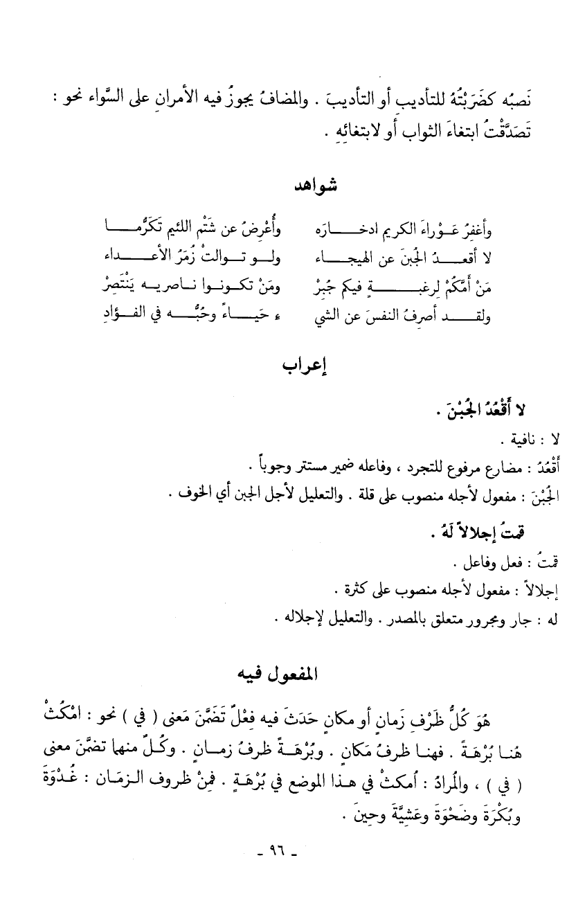 نصبه كضربتهُ للتأديب أو التاديب. والمضاف يجوز فيه الأمران على السواء نحو: تصدقت ابتغاء الثواب آو لابتغائه.