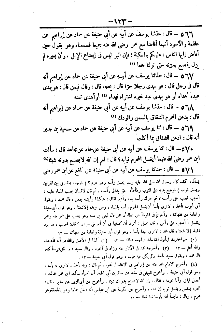 ٥٧٠ - قَالَ: ثنا يُوسُفُ عَنْ أَبِيهِ عَنْ أَبِي حَنِيفَةَ، عَنْ حَمَّادٍ، عَنْ مُجَاهِدٍ، قَالَ: سَأَلْتُ ابْنَ عُمَرَ رَضِيَ اللَّهُ عَنْهُمَا: أَيَغْسِلُ الْمُحْرِمُ ثِيَابَهُ؟ قَالَ: «نَعَمْ، إِنَّ اللَّهَ لَا يَصْنَعُ بِدَرَنِهِ شَيْئًا»