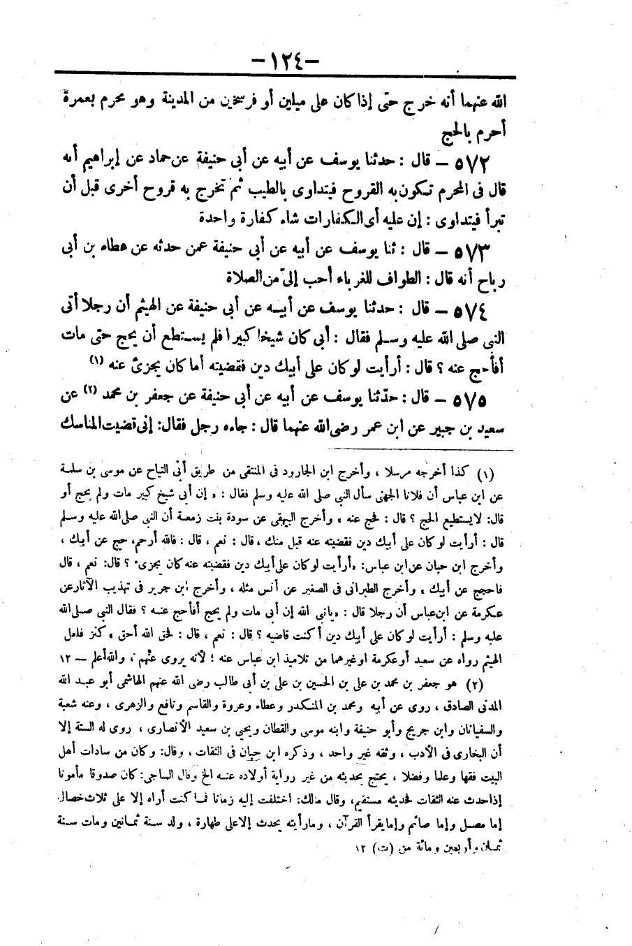 ٥٧٥ - قَالَ: حَدَّثَنَا يُوسُفُ عَنْ أَبِيهِ عَنْ أَبِي حَنِيفَةَ، عَنْ جَعْفَرِ بْنِ مُحَمَّدٍ، عَنْ سَعِيدِ بْنِ جُبَيْرٍ، عَنِ ابْنِ عُمَرَ رَضِيَ اللَّهُ عَنْهُمَا قَالَ: جَاءَهُ رَجُلٌ فَقَالَ: إِنِّي قَضَيْتُ الْمَنَاسِكَ ⦗١٢٥⦘ كُلَّهَا غَيْرَ الطَّوَافِ بِالْبَيْتِ، ثُمَّ وَاقَعْتُ أَهْلِي، قَالَ: «فَاقْضِ مَا بَقِيَ عَلَيْكَ وَأَهْرِقْ دَمًا، وَعَلَيْكَ الْحَجُّ مِنْ قَابِلٍ» ، قَالَ: فَعَادَ عَلَيْهِ فَقَالَ: إِنِّي جِئْتُ مِنْ شُقَّةٍ بَعِيدَةٍ، قَالَ: فَقَالَ لَهُ مِثْلَ قَوْلِهِ