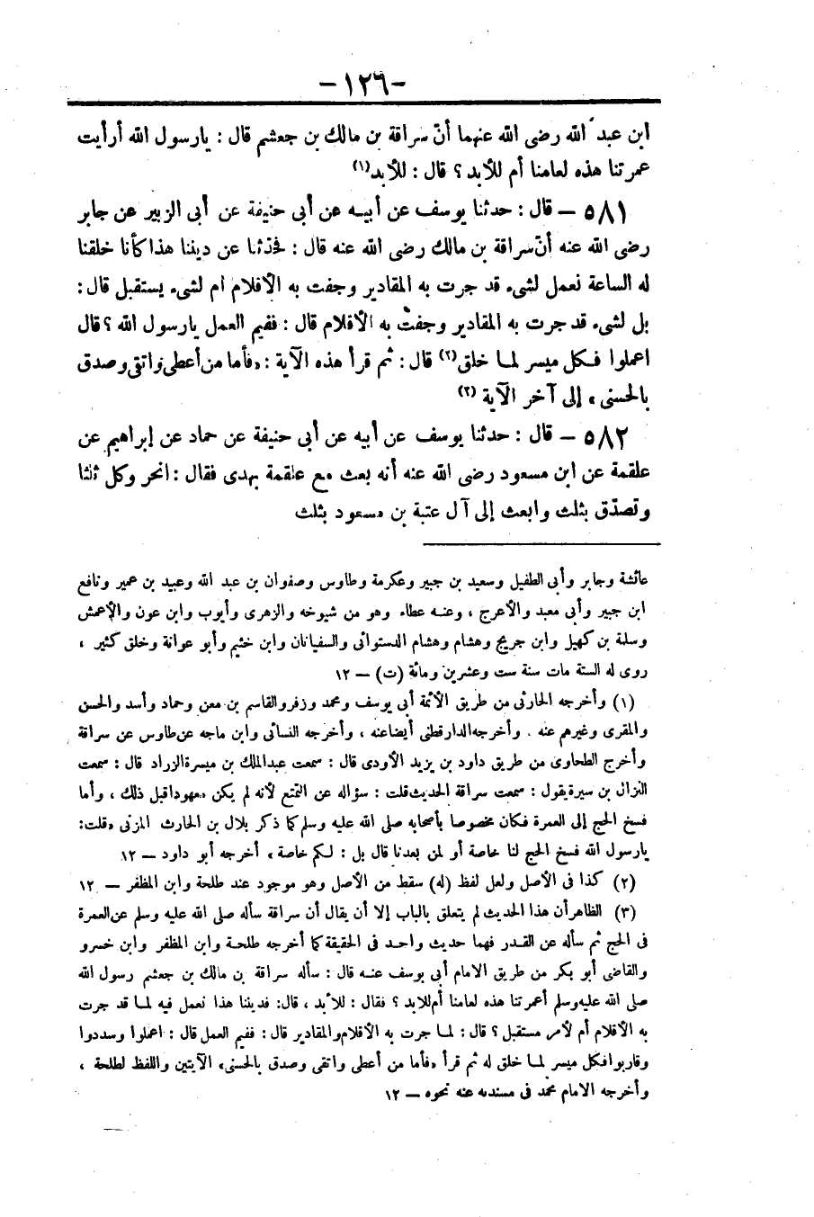 ٥٨١ - قَالَ: حَدَّثَنَا يُوسُفُ عَنْ أَبِيهِ عَنْ أَبِي حَنِيفَةَ، عَنْ أَبِي الزُّبَيْرِ، عَنْ جَابِرٍ رَضِيَ اللَّهُ عَنْهُ: أَنَّ سُرَاقَةَ بْنَ مَالِكٍ رَضِيَ اللَّهُ عَنْهُ قَالَ: فَحُدِّثْنَا عَنْ دِينِنَا هَذَا كَأَنَّا خُلِقْنَا لَهُ السَّاعَةَ نَعْمَلُ لِشَيْءٍ قَدْ جَرَتْ بِهِ الْمَقَادِيرُ وَجَفَّتْ بِهِ الْأَقْلَامُ أَمْ لِشَيْءٍ يُسْتَقْبَلُ؟ قَالَ: «بَلْ لِشَيْءٍ قَدْ جَرَتْ بِهِ الْمَقَادِيرُ، وَجَفَّتْ بِهِ الْأَقْلَامُ» ، قَالَ: فَفِيمَ الْعَمَلُ يَا رَسُولَ اللَّهِ؟ قَالَ: «اعْمَلُوا فَكُلٌّ مُيَسَّرٌ لِمَا خُلِقَ» ، قَالَ: ثُمَّ قَرَأَ الْآيَةَ {فَأَمَّا مَنْ أَعْطَى وَاتَّقَى وَصَدَّقَ بِالْحُسْنَى} [الليل: ٦] إِلَى آخِرِ الْآيَةِ