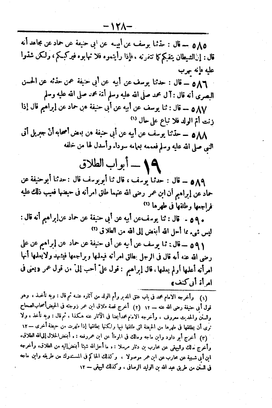 ٥٨٩ - قَالَ: حَدَّثَنَا يُوسُفُ قَالَ: ثنا أَبُو يُوسُفَ قَالَ: حَدَّثَنَا أَبُو حَنِيفَةَ، عَنْ حَمَّادٍ، عَنْ إِبْرَاهِيمَ: أَنَّ ابْنَ عُمَرَ رَضِيَ اللَّهُ عَنْهُمَا «طَلَّقَ امْرَأَتَهُ فِي حَيْضِهَا، فَعِيبَ ذَلِكَ عَلَيْهِ فَرَاجَعَهَا وَطَلَّقَهَا فِي طُهْرِهَا»