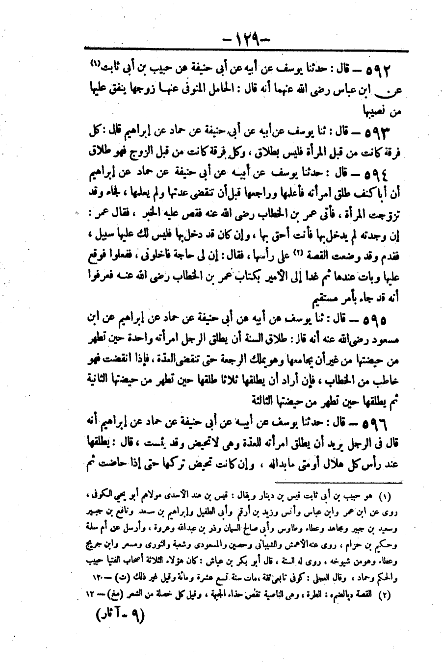 ٥٩٥ - قَالَ: ثنا يُوسُفُ عَنْ أَبِيهِ عَنْ أَبِي حَنِيفَةَ، عَنْ حَمَّادٍ، عَنْ إِبْرَاهِيمَ، عَنِ ابْنِ مَسْعُودٍ رَضِيَ اللَّهُ عَنْهُ أَنَّهُ قَالَ: «طَلَاقُ السُّنَّةِ أَنْ يُطَلِّقَ الرَّجُلُ امْرَأَتَهُ وَاحِدَةً حِينَ تَطْهُرُ مِنْ حَيْضَتِهَا، مِنْ غَيْرِ أَنْ يُجَامِعَهَا، وَهُوَ يَمْلِكُ الرَّجْعَةَ حَتَّى تَنْقَضِيَ الْعِدَّةُ، فَإِذَا انْقَضَتْ فَهُوَ خَاطِبٌ مِنَ الْخُطَّابِ، فَإِنْ أَرَادَ أَنْ يُطَلِّقَهَا ثَلَاثًا طَلَّقَهَا حِينَ تَطْهُرُ مِنْ حَيْضَتِهَا الثَّانِيَةِ، ثُمَّ يُطَلِّقُهَا حِينَ تَطْهُرُ مِنْ حَيْضَتِهَا الثَّالِثَةِ»