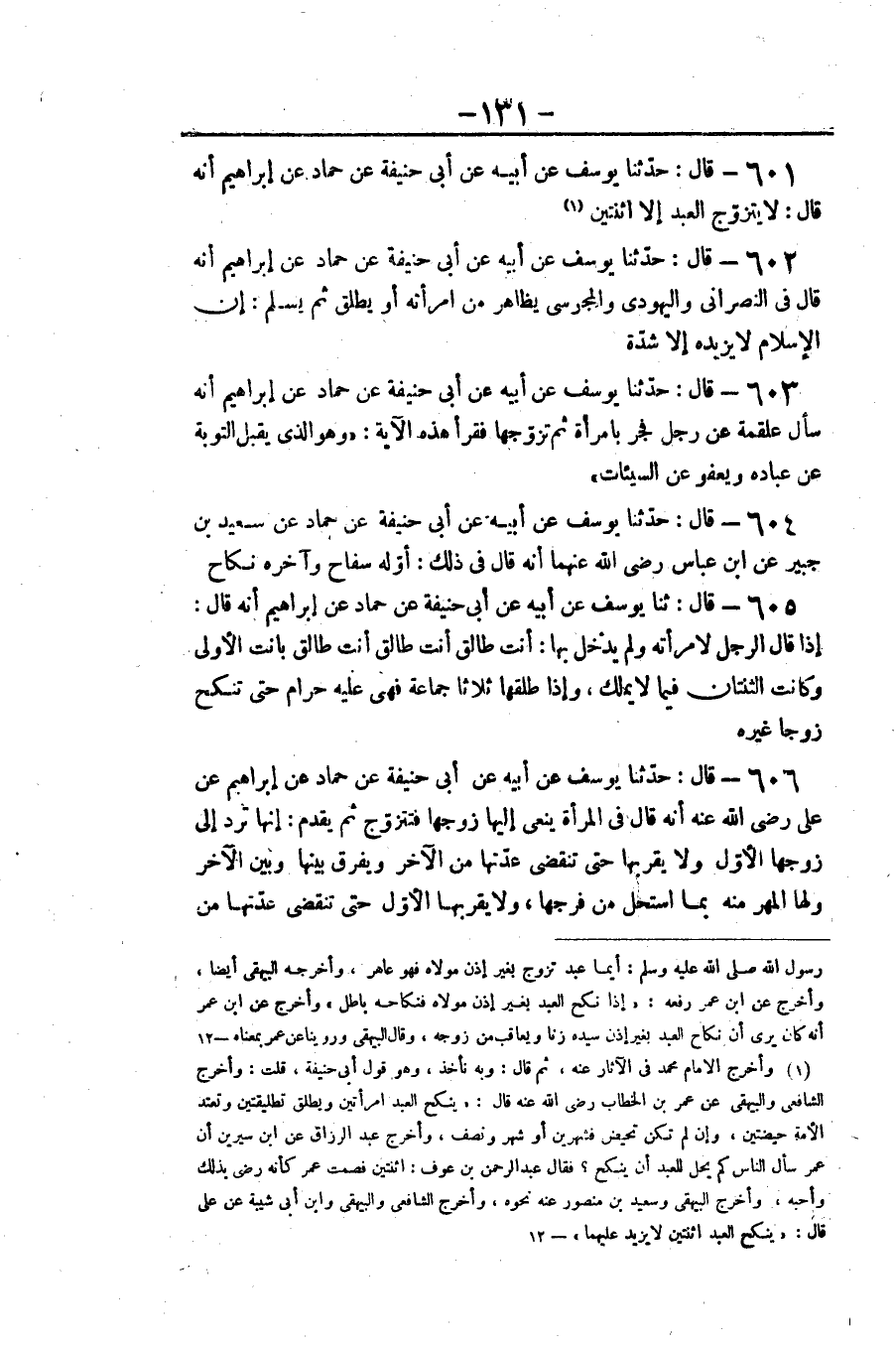 ٦٠١ - قَالَ: حَدَّثَنَا يُوسُفُ عَنْ أَبِيهِ عَنْ أَبِي حَنِيفَةَ، عَنْ حَمَّادٍ، عَنْ إِبْرَاهِيمَ، أَنَّهُ قَالَ: «لَا يَتَزَوَّجُ الْعَبْدُ إِلَّا اثْنَتَيْنِ»