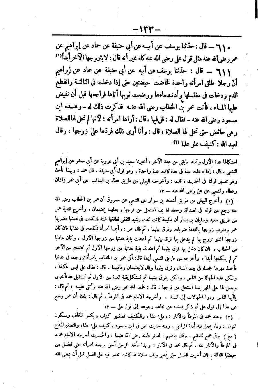 ٦١١ - قَالَ: حَدَّثَنَا يُوسُفُ عَنْ أَبِيهِ عَنْ أَبِي حَنِيفَةَ، عَنْ حَمَّادٍ، عَنْ إِبْرَاهِيمَ: أَنَّ رَجُلًا طَلَّقَ امْرَأَتَهُ وَاحِدَةً، فَحَاضَتْ حَيْضَتَيْنِ، حَتَّى إِذَا دَخَلَتْ فِي الثَّالِثَةِ وَانْقَطَعَ الدَّمُ، وَدَخَلَتْ فِي مُغْتَسَلِهَا وَأَدْنَتْ مَاءَهَا، وَوَضَعَتْ ثَوْبَهَا أَتَاهَا فَرَاجَعَهَا قَبْلَ أَنْ تُفِيضَ عَلَيْهَا الْمَاءَ، فَأَتَتْ عُمَرَ بْنَ الْخَطَّابِ رَضِيَ اللَّهُ عَنْهُ فَذَكَرَتْ ذَلِكَ لَهُ، وَعِنْدَهُ ابْنُ مَسْعُودٍ رَضِيَ اللَّهُ عَنْهُ، فَقَالَ لَهُ: قُلْ فِيهَا، قَالَ: «أَرَاهَا امْرَأَتَهُ؛ لِأَنَّهَا لَمْ تَحِلْ لَهَا الصَّلَاةُ وَهِيَ حَائِضٌ حَتَّى تَحِلَّ لَهَا الصَّلَاةُ» ، قَالَ: وَأَنَا أَرَى ذَلِكَ، فَرَدَّهَا عَلَى زَوْجِهَا وَقَالَ: لَعَبْدُ اللَّهِ: كَنِيفٌ مَمْلُوءٌ عِلْمًا