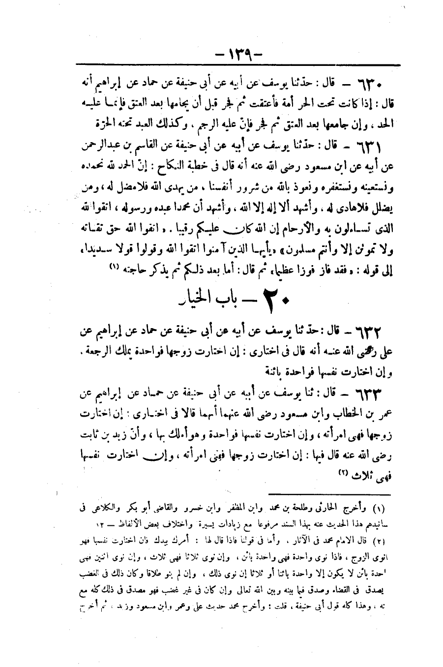 ٦٣٣ - قَالَ: حَدَّثَنَا يُوسُفُ عَنْ أَبِيهِ عَنْ أَبِي حَنِيفَةَ، عَنْ حَمَّادٍ، عَنْ إِبْرَاهِيمَ، عَنْ عُمَرَ بْنِ الْخَطَّابِ، وَابْنِ مَسْعُودٍ رَضِيَ اللَّهُ عَنْهُمَا أَنَّهُمَا قَالَا فِي اخْتَارِي: «إِنِ اخْتَارَتْ زَوْجَهَا فَهِيَ امْرَأَتُهُ، وَإِنِ اخْتَارَتْ نَفْسَهَا فَوَاحِدَةٌ وَهُوَ أَمْلَكُ بِهَا» وَإِنَّ زَيْدَ بْنَ ثَابِتٍ رَضِيَ اللَّهُ عَنْهُ قَالَ فِيهَا: «إِنِ اخْتَارَتْ زَوْجَهَا فَهِيَ امْرَأَتُهُ، وَإِنِ اخْتَارَتْ نَفْسَهَا فَهِيَ ثَلَاثٌ»