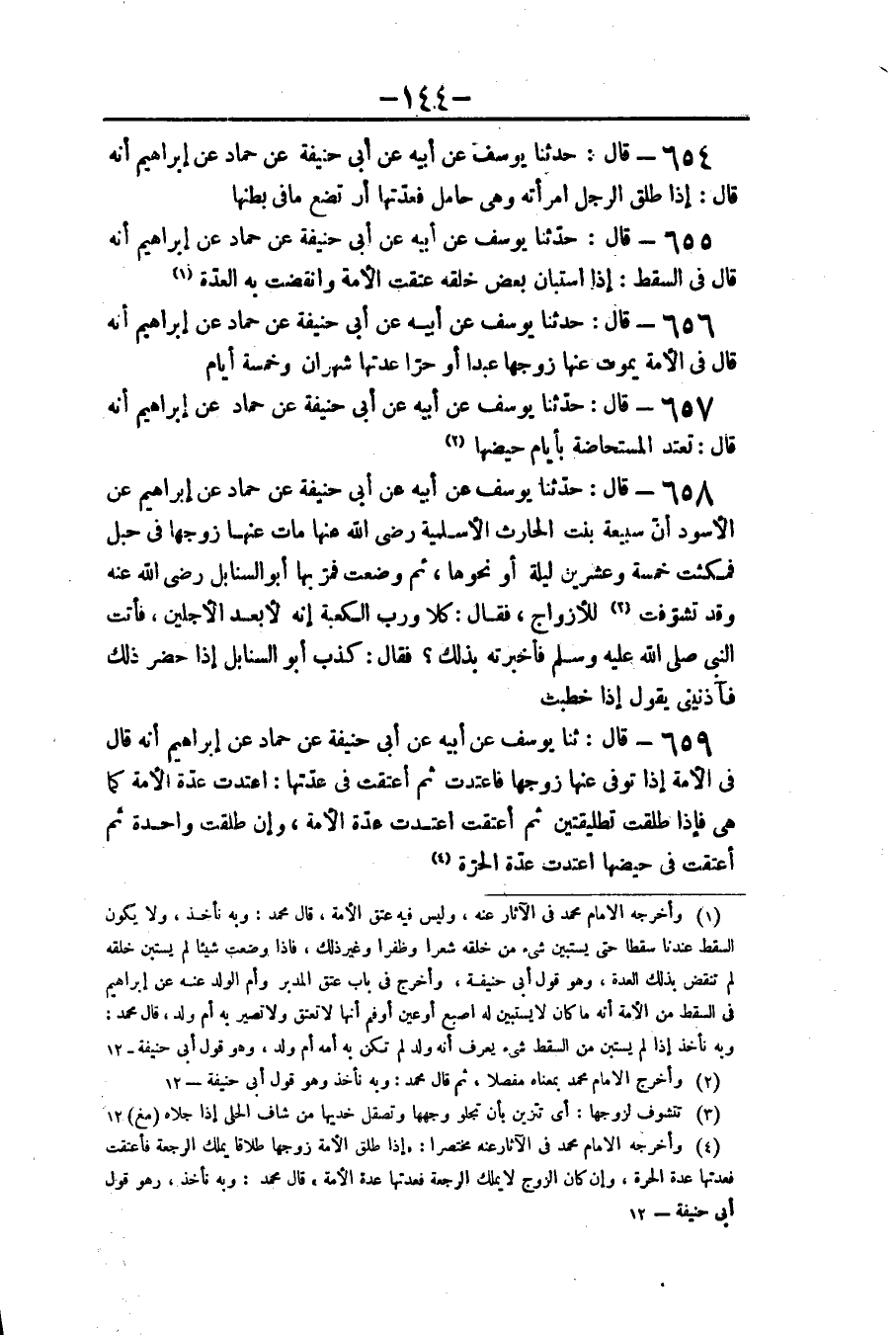 ٦٥٩ - قَالَ: ثنا يُوسُفُ عَنْ أَبِيهِ عَنْ أَبِي حَنِيفَةَ، عَنْ حَمَّادٍ، عَنْ إِبْرَاهِيمَ، أَنَّهُ قَالَ فِي الْأَمَةِ إِذَا تُوُفِّيَ عَنْهَا زَوْجُهَا فَاعْتَدَّتْ ثُمَّ أُعْتِقَتْ فِي عِدَّتِهَا: «اعْتَدَّتْ عِدَّةَ الْأَمَةِ كَمَا هِيَ، فَإِذَا طُلِّقَتْ تَطْلِيقَتَيْنِ ثُمَّ أُعْتِقَتِ اعْتَدَّتْ عِدَّةَ الْأَمَةِ، وَإِنْ طُلِّقَتْ وَاحِدَةً ثُمَّ أُعْتِقَتْ فِي حَيْضِهَا اعْتَدَّتْ عِدَّةَ الْحُرَّةِ»