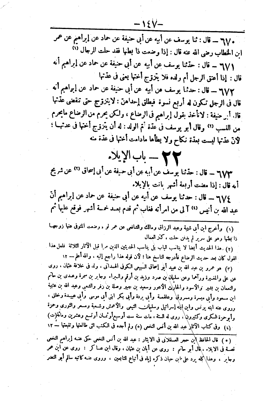 ٦٧٢ - قَالَ: حَدَّثَنَا يُوسُفُ عَنْ أَبِيهِ عَنْ أَبِي حَنِيفَةَ، عَنْ حَمَّادٍ، عَنْ إِبْرَاهِيمَ، أَنَّهُ قَالَ فِي الرَّجُلِ تَكُونُ لَهُ أَرْبَعُ نِسْوَةٍ فَيُطَلِّقُ إِحْدَاهُنَّ: «لَا يَتَزَوَّجُ حَتَّى تَنْقَضِيَ عِدَّتُهَا» قَالَ أَبُو حَنِيفَةَ: لَا نَأْخُذُ بِقَوْلِ إِبْرَاهِيمَ فِي الرَّضَاعِ، وَلَكِنْ يَحْرُمُ مِنَ الرَّضَاعِ مَا يَحْرُمُ مِنَ النَّسَبِ، وَقَالَ أَبُو يُوسُفَ فِي عِدَّةِ أُمِّ الْوَلَدِ: لَهُ أَنْ يَتَزَوَّجَ أُخْتَهَا فِي عِدَّتِهَا؛ لِأَنَّ عِدَّتَهَا لَيْسَتْ بِعِدَّةِ نِكَاحٍ وَلَا يَطَؤُهَا مَا دَامَتْ أُخْتُهَا فِي عِدَّةٍ مِنْهُ