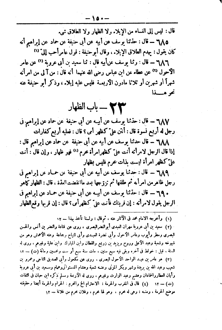 ٦٨٧ - قَالَ: حَدَّثَنَا يُوسُفُ عَنْ أَبِيهِ عَنْ أَبِي حَنِيفَةَ، عَنْ حَمَّادٍ، عَنْ إِبْرَاهِيمَ، فِي رَجُلٍ لَهُ أَرْبَعُ نِسْوَةٍ قَالَ: أَنْتُنَّ عَلَيَّ كَظَهْرِ أُمِّي؟ قَالَ: «فَعَلَيْهِ أَرْبَعُ كَفَّارَاتٍ»