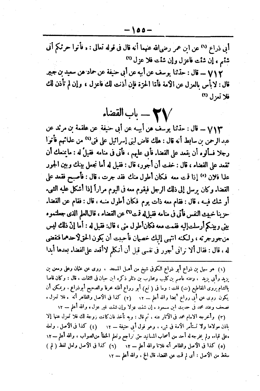 ٧١٢ - قَالَ: حَدَّثَنَا يُوسُفُ عَنْ أَبِيهِ عَنْ أَبِي حَنِيفَةَ، عَنْ حَمَّادٍ، عَنْ سَعِيدِ بْنِ جُبَيْرٍ، قَالَ: «لَا بَأْسَ بِالْعَزْلِ عَنِ الْأَمَةِ، فَأَمَّا الْحُرَّةُ، فَإِنْ أَذِنَتْ لَكَ فَاعْزِلْ وَإِنْ لَمْ تَأْذَنْ لَكَ فَلَا تَعْزِلْ»