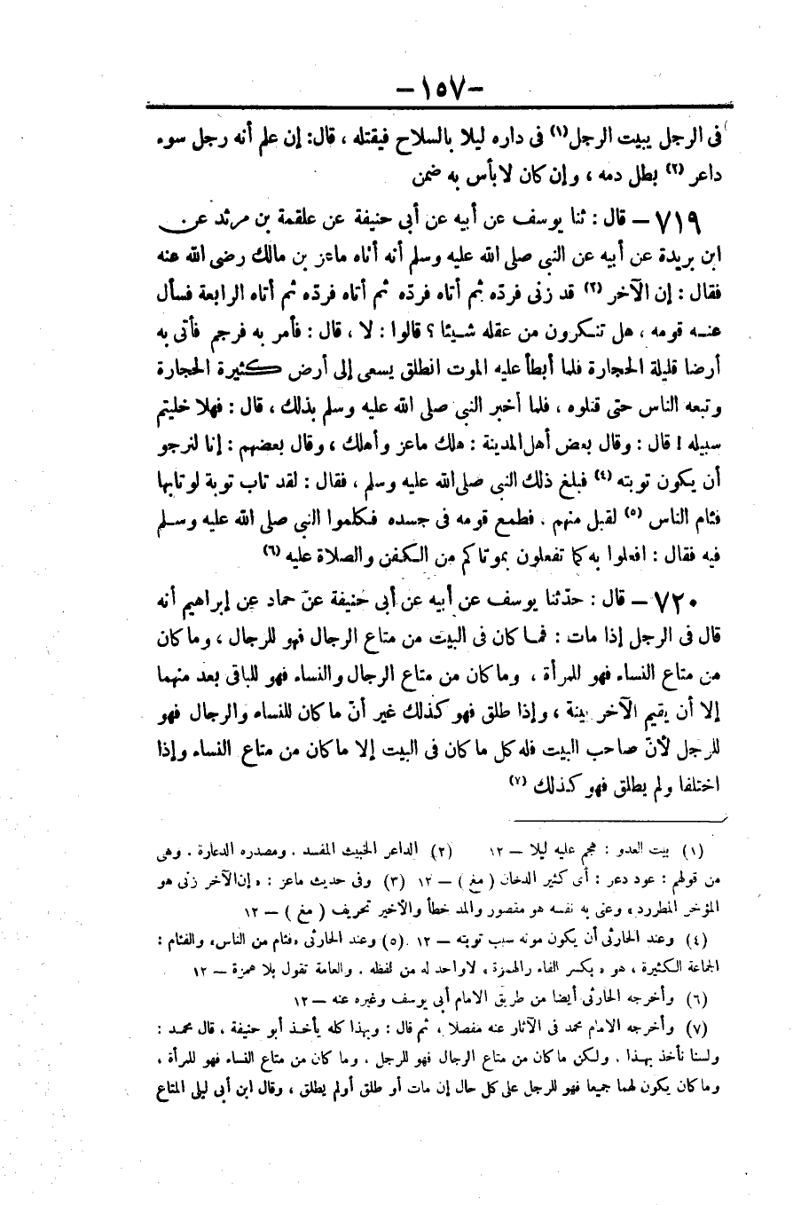 ٧١٩ - قَالَ: ثنا يُوسُفُ عَنْ أَبِيهِ عَنْ أَبِي حَنِيفَةَ، عَنْ عَلْقَمَةَ بْنِ مَرْثَدٍ، عَنِ ابْنِ بُرَيْدَةَ، عَنْ أَبِيهِ، عَنِ النَّبِيِّ صَلَّى اللهُ عَلَيْهِ وَسَلَّمَ أَنَّهُ أَتَاهُ مَاعِزُ بْنُ مَالِكٍ رَضِيَ اللَّهُ عَنْهُ فَقَالَ: إِنَّ الْآخَرَ قَدْ زَنَى، فَرَدَّهُ، ثُمَّ أَتَاهُ فَرَدَّهُ، ثُمَّ أَتَاهُ، فَرَدَّهُ، ثُمَّ أَتَاهُ الرَّابِعَةَ فَسَأَلَ عَنْهُ قَوْمَهُ: «هَلْ تُنْكِرُونَ مِنْ عَقْلِهِ شَيْئًا؟» قَالُوا: لَا، قَالَ: فَأَمَرَ بِهِ فَرُجِمَ، فَأُتِيَ بِهِ أَرْضًا قَلِيلَةَ الْحِجَارَةِ، فَلَمَّا أَبْطَأَ عَلَيْهِ الْمَوْتُ انْطَلَقَ يَسْعَى إِلَى أَرْضٍ كَثِيرَةِ الْحِجَارَةِ، وَتَبِعَهُ النَّاسُ حَتَّى قَتَلُوهُ، فَلَمَّا أُخْبِرَ النَّبِيُّ صَلَّى اللهُ عَلَيْهِ وَسَلَّمَ بِذَلِكَ قَالَ: «فَهَلَّا خَلَّيْتُمْ سَبِيلَهُ» ، قَالَ: وَقَالَ بَعْضُ أَهْلِ الْمَدِينَةِ: هَلَكَ مَاعِزٌ وَأَهْلَكَ، وَقَالَ بَعْضُهُمْ: إِنَّا لَنَرْجُو أَنْ يَكُونَ تَوْبَتَهُ، فَبَلَغَ ذَلِكَ النَّبِيَّ صَلَّى اللهُ عَلَيْهِ وَسَلَّمَ فَقَالَ: «لَقَدْ تَابَ تَوْبَةً لَوْ تَابَهَا فِئَامُ النَّاسِ لَقُبِلَ مِنْهُمْ» فَطَمِعَ قَوْمُهُ فِي جَسَدِهِ، فَكَلَّمُوا النَّبِيَّ صَلَّى اللهُ عَلَيْهِ وَسَلَّمَ فِيهِ، فَقَالَ: «افْعَلُوا بِهِ كَمَا تَفْعَلُونَ بِمَوْتَاكُمْ مِنَ الْكَفَنِ وَالصَّلَاةِ عَلَيْهِ»