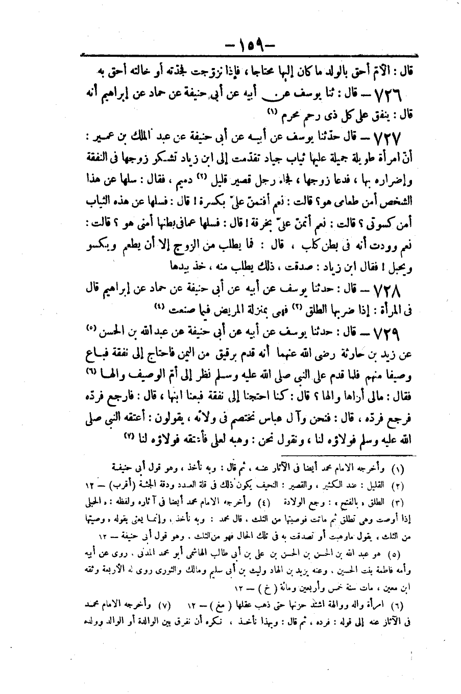 ٧٢٩ - قَالَ: حَدَّثَنَا يُوسُفُ عَنْ أَبِيهِ عَنْ أَبِي حَنِيفَةَ، عَنْ عَبْدِ اللَّهِ بْنِ الْحَسَنِ، عَنْ زَيْدِ بْنِ حَارِثَةَ رَضِيَ اللَّهُ عَنْهُمَا أَنَّهُ قَدِمَ بِرَقِيقٍ مِنَ الْيَمَنِ، فَاحْتَاجَ إِلَى نَفَقَةٍ فَبَاعَ وَصِيفًا مِنْهُمْ، فَلَمَّا قَدِمَ عَلَى النَّبِيِّ صَلَّى اللهُ عَلَيْهِ وَسَلَّمَ نَظَرَ إِلَى أُمِّ الْوَصِيفِ وَالِهًا فَقَالَ: «مَالِي أَرَاهَا وَالِهًا؟» قَالَ: كُنَّا احْتَجْنَا إِلَى نَفَقَةٍ فَبِعْنَا ابْنَهَا، قَالَ: «فَارْجِعْ فَرُدَّهُ» فَرَجَعَ فَرَدَّهُ، قَالَ: فَنَحْنُ وَآلُ عَبَّاسٍ نَخْتَصِمُ فِي وَلَائِهِ، يَقُولُونَ: أَعْتَقَهُ النَّبِيُّ صَلَّى اللهُ عَلَيْهِ وَسَلَّمَ فَوَلَاؤُهُ لَنَا، وَنَقُولُ نَحْنُ: وَهَبَهُ لِعَلِيٍّ فَأَعْتَقَهُ فَوَلَاؤُهُ لَنَا "