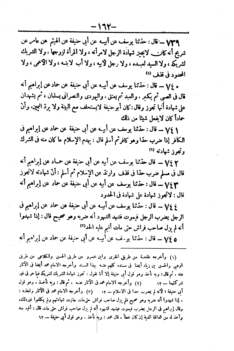 ٧٤٣ - قَالَ: حَدَّثَنَا يُوسُفُ عَنْ أَبِيهِ عَنْ أَبِي حَنِيفَةَ، عَنْ حَمَّادٍ، عَنْ إِبْرَاهِيمَ، أَنَّهُ قَالَ: «لَا تَجُوزُ شَهَادَةٌ عَلَى شَهَادَةٍ فِي الْحُدُودِ»