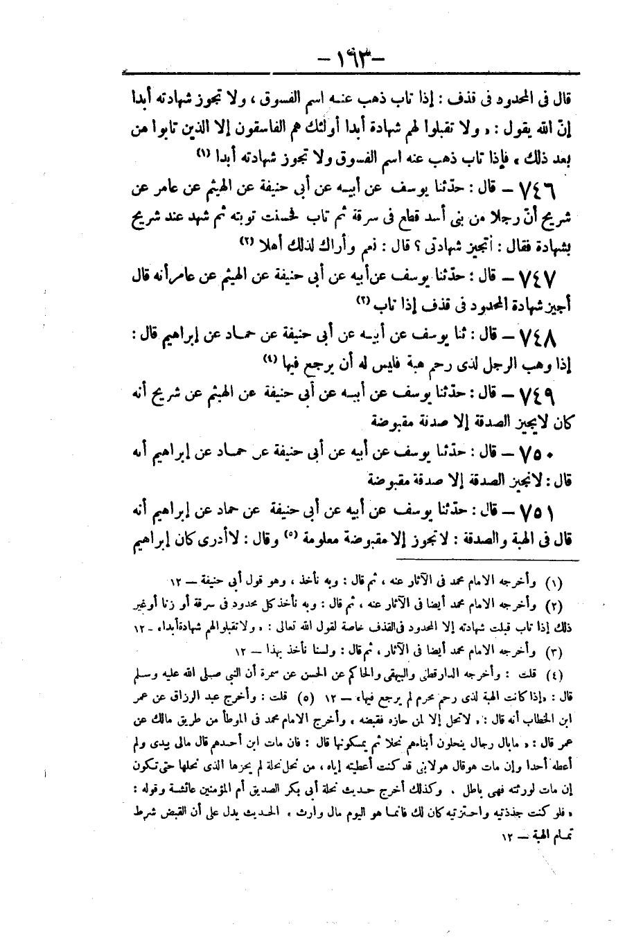 ٧٤٧ - قَالَ: حَدَّثَنَا يُوسُفُ عَنْ أَبِيهِ عَنْ أَبِي حَنِيفَةَ، عَنِ الْهَيْثَمِ، عَنْ عَامِرٍ، أَنَّهُ قَالَ: «أُجِيزُ شَهَادَةَ الْمَحْدُودِ فِي قَذْفٍ إِذَا تَابَ»
