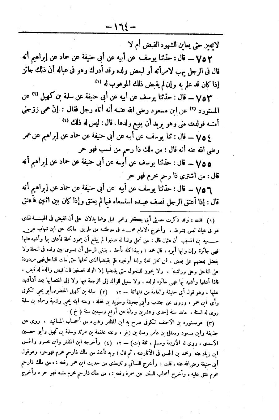 ٧٥٤ - قَالَ: ثنا يُوسُفُ عَنْ أَبِيهِ عَنْ أَبِي حَنِيفَةَ، عَنْ حَمَّادٍ، عَنْ إِبْرَاهِيمَ، عَنْ عُمَرَ رَضِيَ اللَّهُ عَنْهُ أَنَّهُ قَالَ: «مَنْ مَلَكَ ذَا رَحِمٍ مِنْ نَسَبٍ فَهُوَ حُرٌّ»