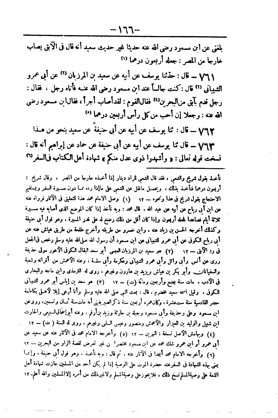 ٧٦١ - قَالَ: حَدَّثَنَا يُوسُفُ عَنْ أَبِيهِ عَنْ أَبِيهِ، عَنْ سَعِيدِ بْنِ الْمَرْزُبَانِ، عَنْ أَبِي عَمْرٍو الشَّيْبَانِيِّ، قَالَ: كُنْتُ جَالِسًا عِنْدَ ابْنِ مَسْعُودٍ رَضِيَ اللَّهُ عَنْهُ، فَأَتَاهُ رَجُلٌ فَقَالَ: رَجُلٌ قَدِمَ بِآبِقٍ مِنَ الْبَحْرَيْنِ، فَقَالَ الْقَوْمُ: لَقَدْ أَصَابَ أَجْرًا، فَقَالَ ابْنُ مَسْعُودٍ رَضِيَ اللَّهُ عَنْهُ: «وَجُعْلًا إِنْ أَحَبَّ مِنْ كُلِّ رَأْسٍ أَرْبَعِينَ دِرْهَمًا»