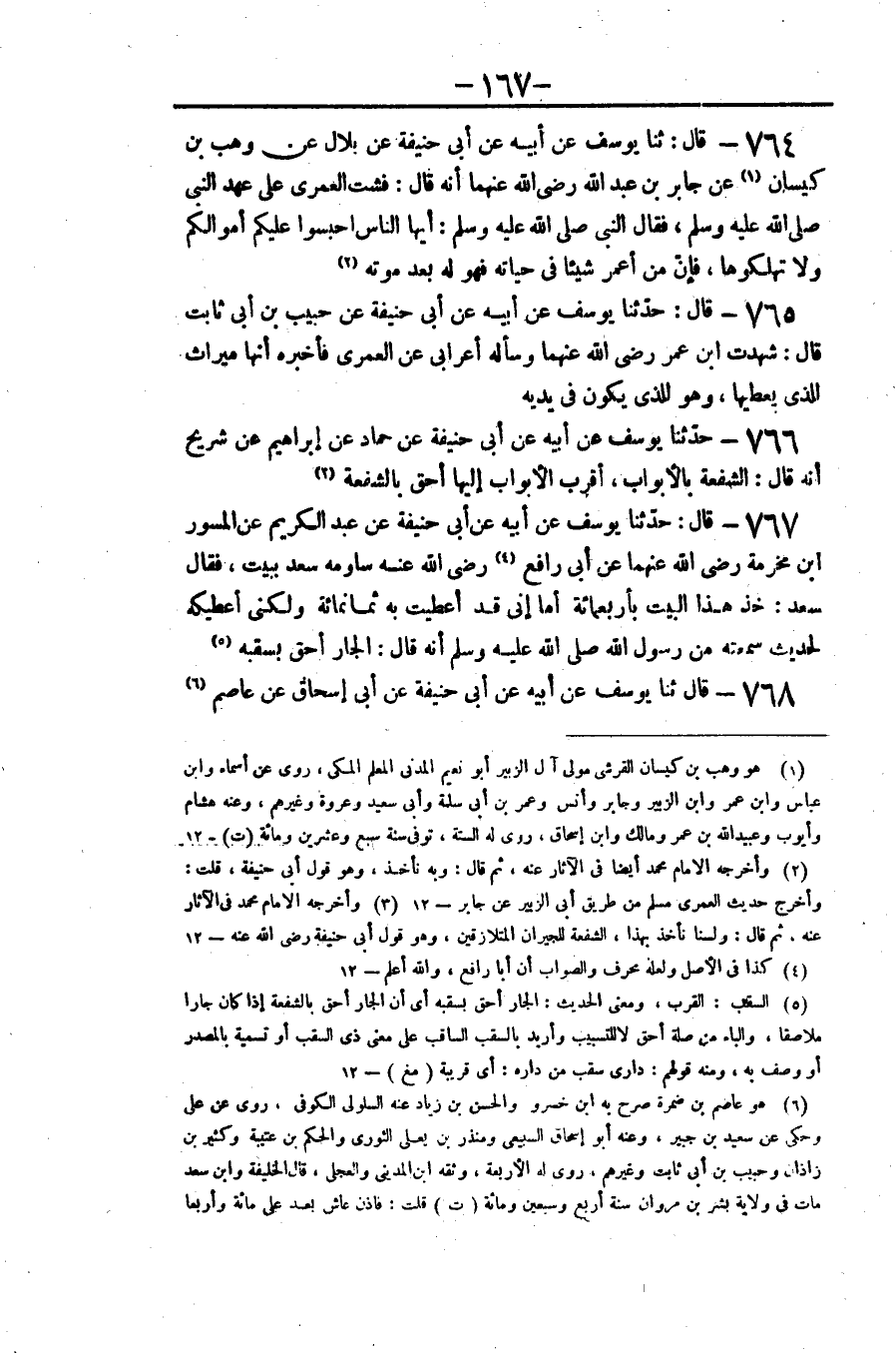 ٧٦٤ - قَالَ: ثنا يُوسُفُ عَنْ أَبِيهِ عَنْ أَبِي حَنِيفَةَ، عَنْ بِلَالٍ، عَنْ وَهْبِ بْنِ كَيْسَانَ، عَنْ جَابِرِ بْنِ عَبْدِ اللَّهِ رَضِيَ اللَّهُ عَنْهُمَا، أَنَّهُ قَالَ: فَشَتِ الْعُمْرَى عَلَى عَهْدِ النَّبِيِّ صَلَّى اللهُ عَلَيْهِ وَسَلَّمَ، فَقَالَ النَّبِيُّ صَلَّى اللهُ عَلَيْهِ وَسَلَّمَ: «أَيُّهَا النَّاسُ، احْبِسُوا عَلَيْكُمْ أَمْوَالَكُمْ وَلَا تُهْلِكُوهَا، فَإِنَّ مَنْ أَعْمَرَ شَيْئًا فِي حَيَاتِهِ فَهُوَ لَهُ بَعْدَ مَوْتِهِ»